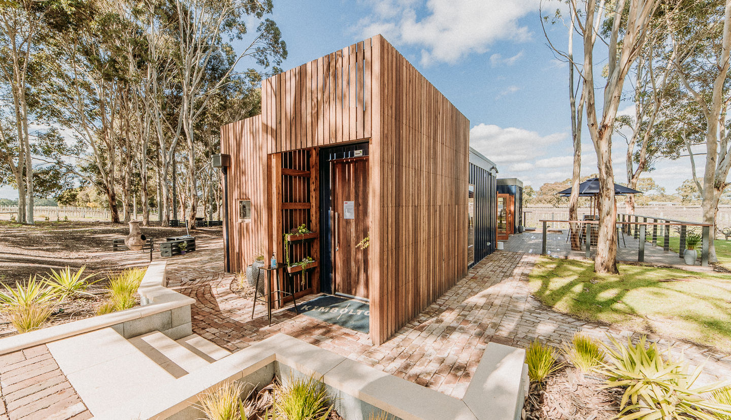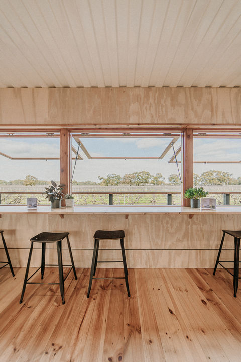 This delightful project is built primarily with shipping containers and plywood, creating an intimate yet playful cellar door experience.