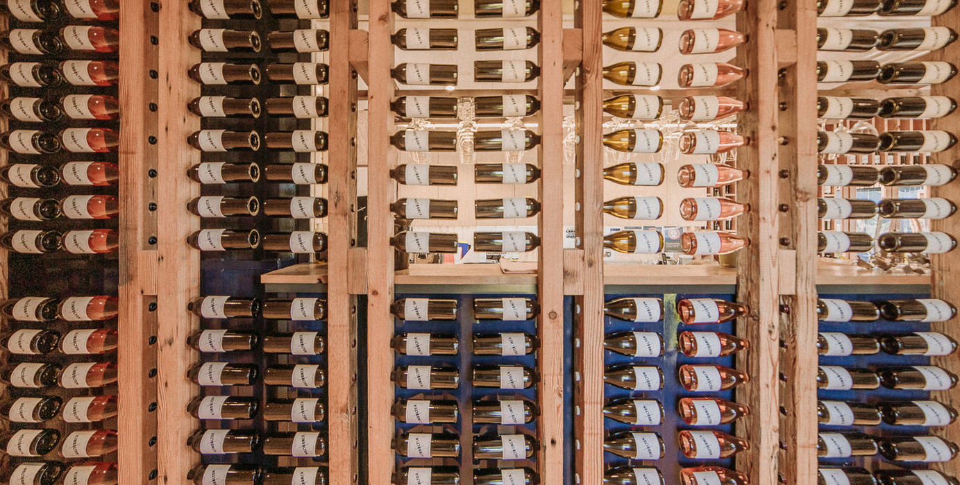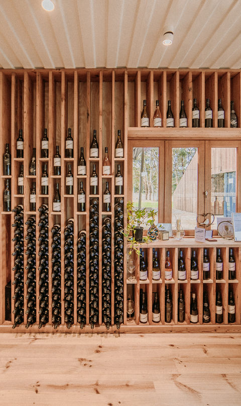 The entrance leads to a rich plywood and timber-clad interior, flanked by the winery's signature collection of bottles.