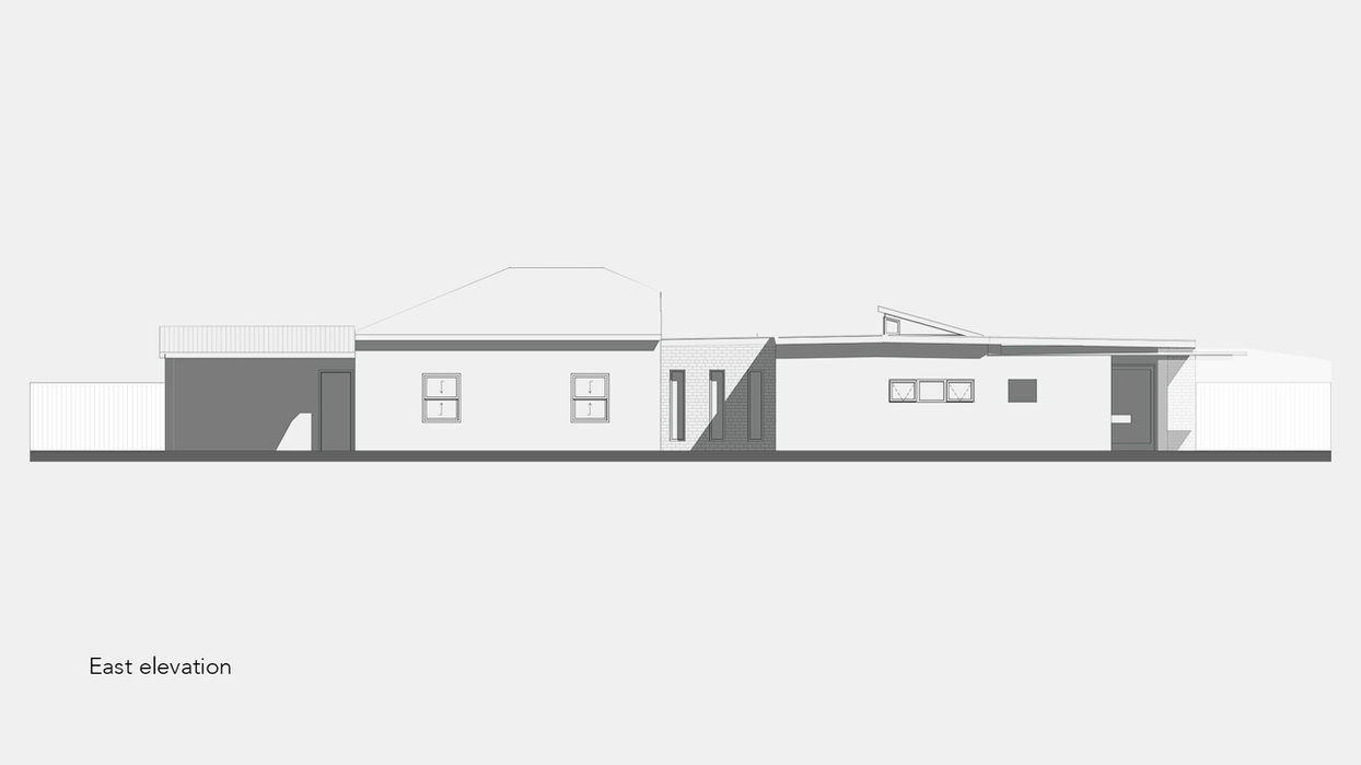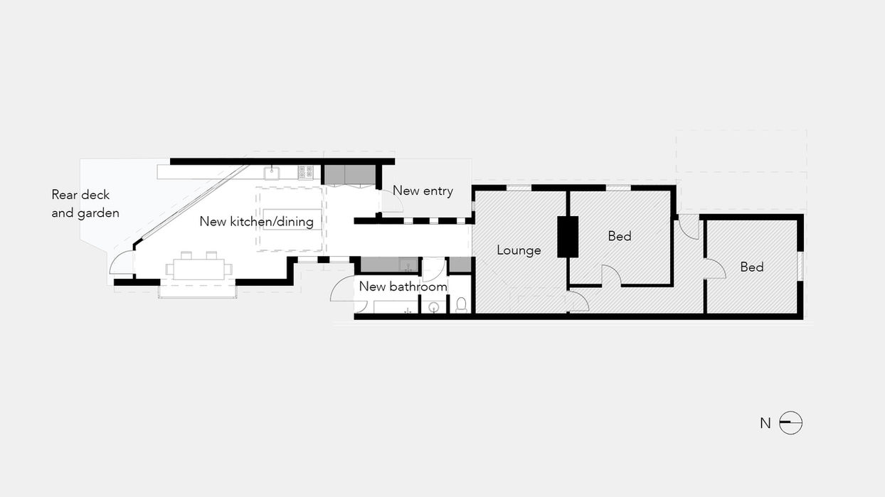 The design incorporates new kitchen, dining and bathroom facilities with a unique sliding door on the diagonal, opening up to the back yard.