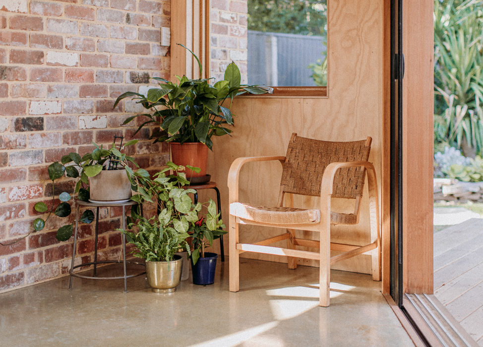 A new side entrance has been carved into the side of the old house, an intimate nook clad in recycled brick.